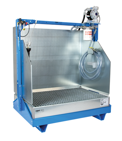 Zentrale Altölsammel- und Umfüllstation zur Ablage ölverschmutzter Teile wie Filter, Schläuche, Kanister, Kannen und zur Absaugung von Unterfahrwannen und Fässern. Entspricht den gesetzlichen Anforderungen nach einem gekennzeichneten Lagerplatz.