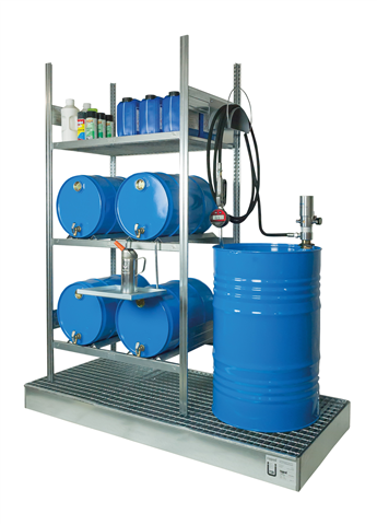 Für die umweltgerechte Lagerung von Originalgebinden mit wassergefährdenden Flüssigkeiten wie Motoröl, Getriebeöl, Hydrauliköl und ähnliche Flüssigkeiten.