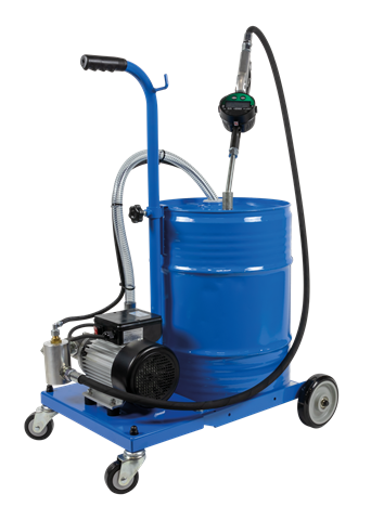 Mobiles Ölabgabeset in elektrischer Ausführung, für die Aufnahme von einem 60 Ltr.-Fass, eichfähig. Durch die sehr niedrig gehaltene Ladefläche ist ein Wechseln der Fässer schnell und einfach möglich.