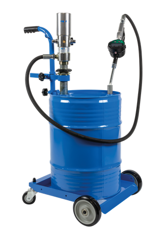 Mobiles Ölabgabeset in pneumatischer Ausführung, für die Aufnahme von einem 60 Ltr.-Fass, eichfähig / MID-konform. Durch die sehr niedrig gehaltene Ladefläche ist ein Wechseln der Fässer schnell und einfach möglich.
