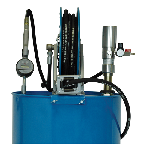 Stationäre Ausführung zur Montage auf 200 Ltr. Ölfässer. Ermöglicht einen Versorgungsradius bis zu 10 m in einer kompakten und praktischen Ausführung.