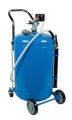 Mobiler Ölspender mit einem Fassungsvermögen von bis zu 80 Liter für die netzunabhängige Ölabgabe. Die Befüllung erfolgt aus Fässern mit 50-, 60- oder 200 Litern Inhalt mittels Schwerkraft und mit Hilfe eines Einfülltrichters oder auch aus Tanks mittels einer Umfüllpumpe.