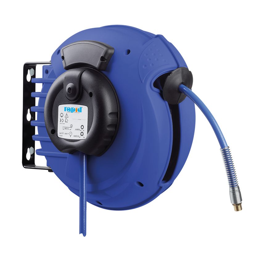Automatischer Schlauchaufroller für Luft mit PU-Schlauch, zur Wand- oder Deckenmontage.