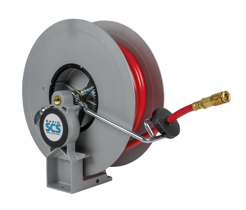 • Automatischer Schlauchaufroller aus Aluminiumguss mit verzinktem, schwenkbarem Auslaufbügel