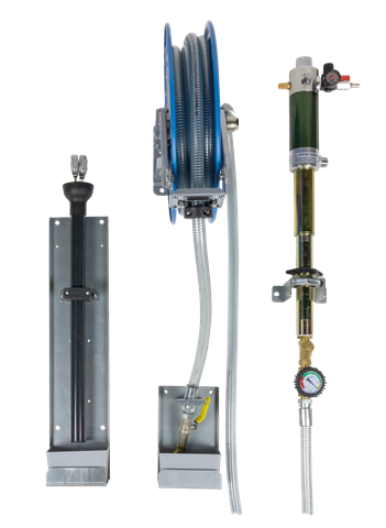 Altölabsaugset mit pneumatischer Kolbenpumpe und automatischem Vakuumschlauchaufroller. Die Altölabsaugung erfolgt durch den Ölschaft mittels Sonde oder Adapter.