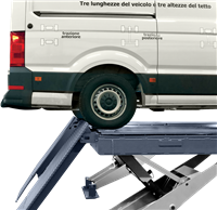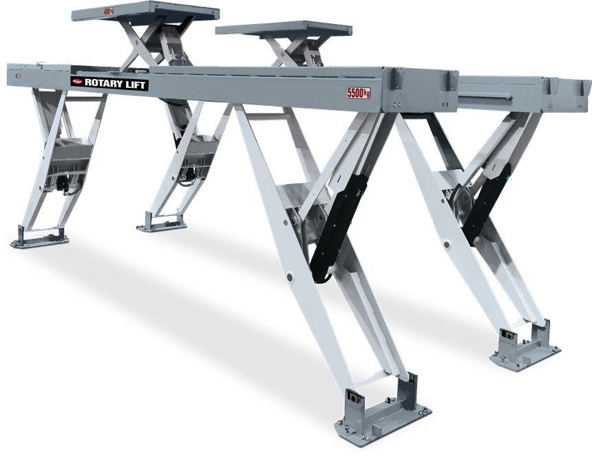 - Hochpräzise Vertikal-Scherenhebebühnen für Achsvermessungsarbeiten und Diagnosearbeitsplätze mit 5,5 t Tragkraft und 5'400 mm nutzbarer Fahrbahnlänge.