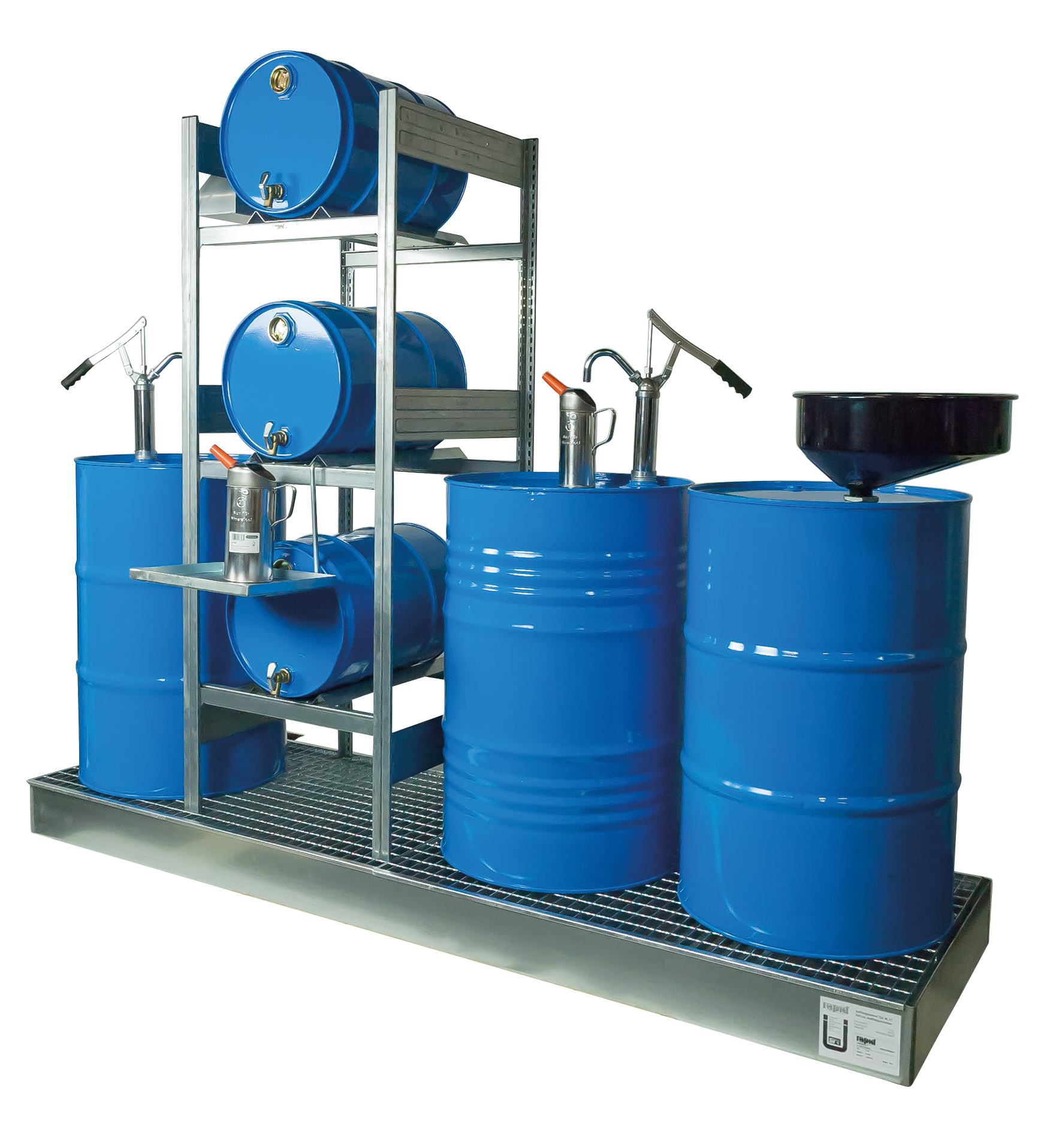 Für umweltgerechte Lagerung von Originalgebinden mit wassergefährdenden Flüssigkeiten wie Motorenöl, Getriebeöl, Hydrauliköl und ähnliche Flüssigkeiten