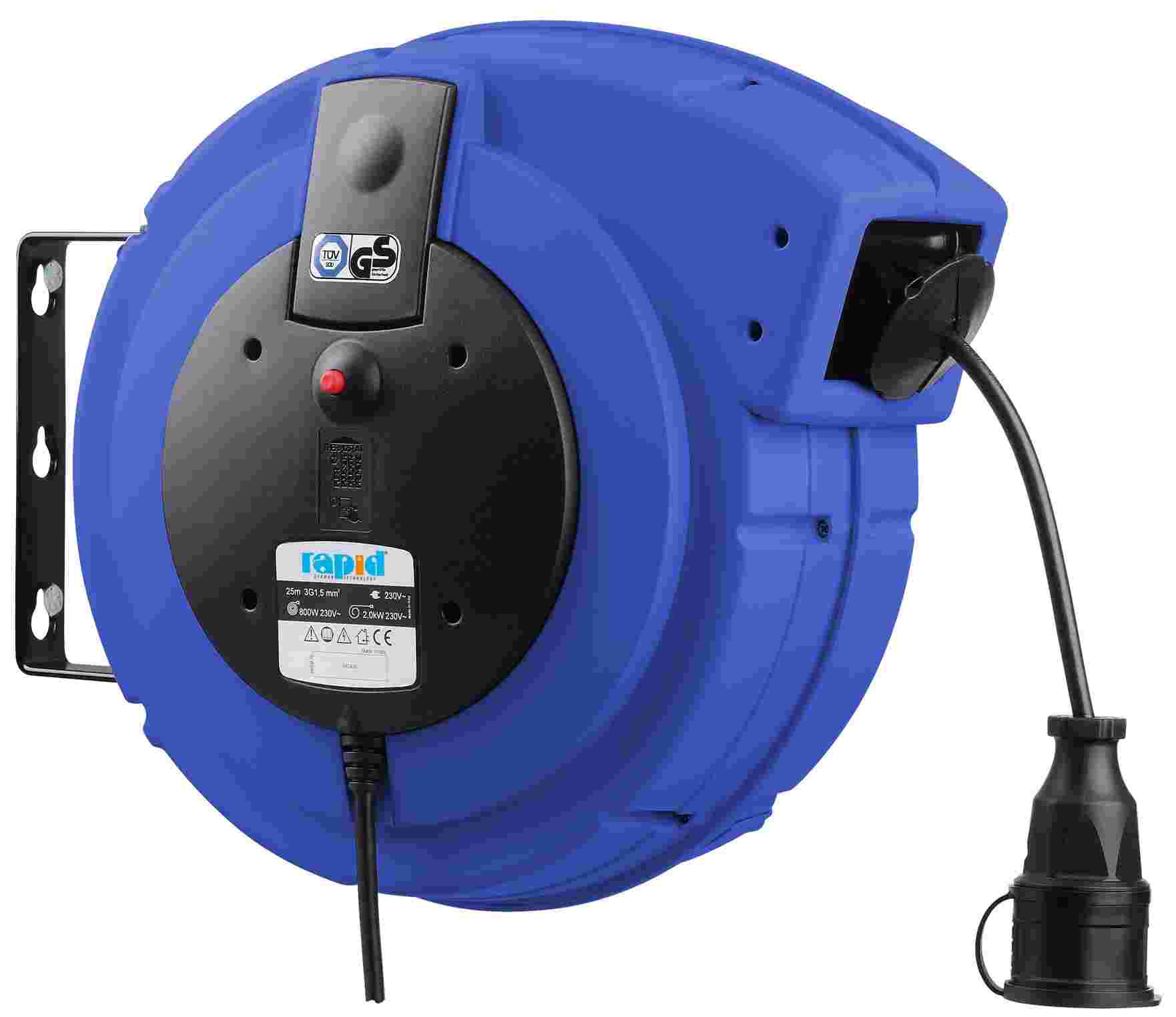 Automatischer 230 V~ Kabelaufroller mit 20 m Kabel, zur Wand- oder Deckenmontage.
