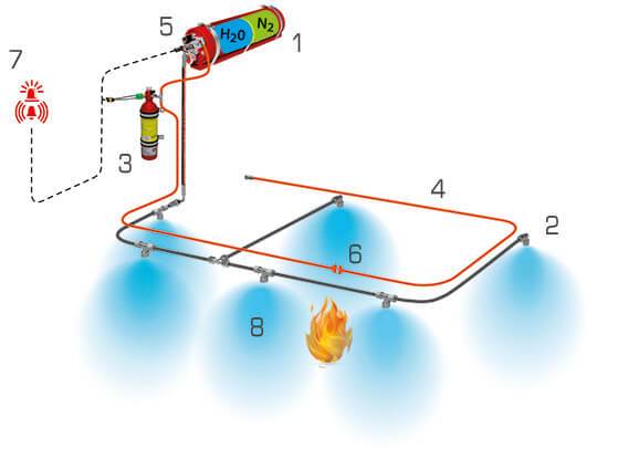 Sobald der Detektorschlauch durch Hitze platzt, aktiviert sich das System automatisch. Der Wassernebel stoppt nicht nur die Flammen, sondern schützt auch vor Wiederaufflammen.