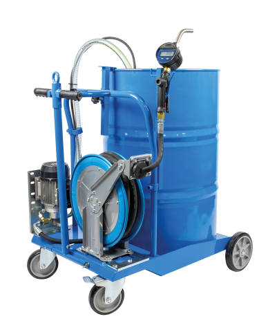Abgabeset in elektrischer Ausführung und mit Schlauchaufroller, für die Aufnahme von einem 200 Ltr.-Fass, nicht eichfähig.