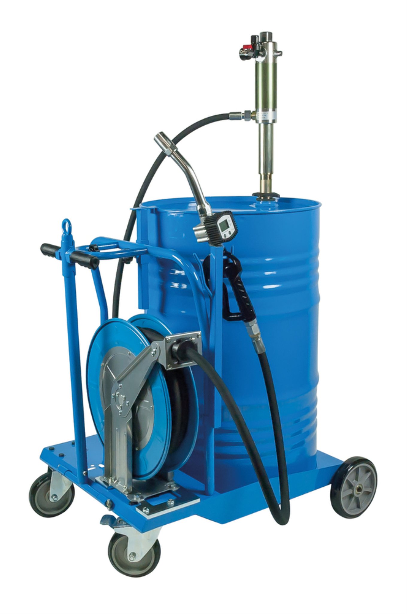 Mobiles LKW-Ölabgabeset in pneumatischer Ausführung und mit Schlauchaufroller, für die Aufnahme von einem 200 Ltr.-Fass. Durch die sehr niedrig gehaltene Ladefläche ist ein Wechseln der Fässer schnell und einfach möglich.
