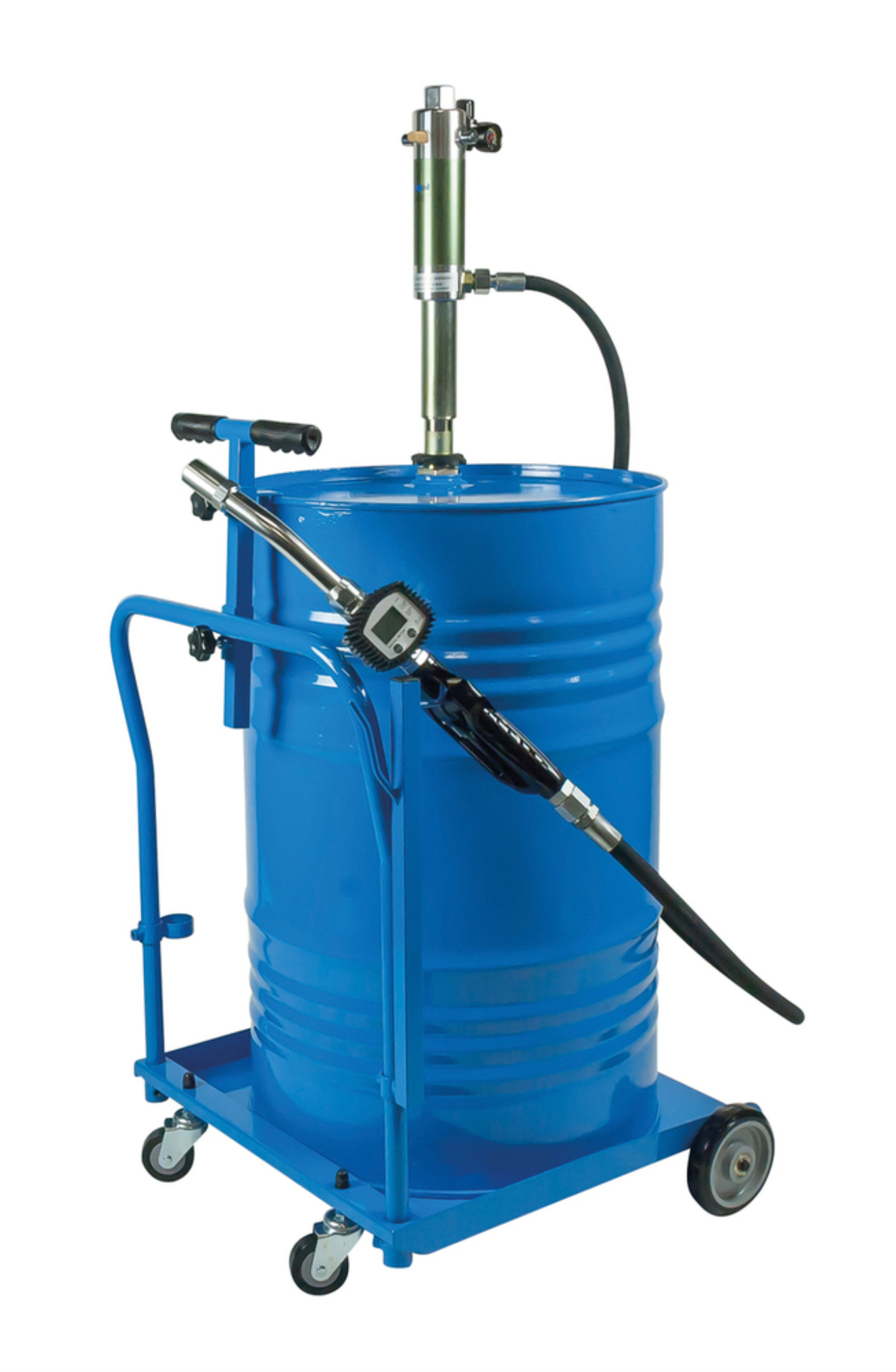 Mobiles LKW-Ölabgabeset in pneumatischer Ausführung, für die Aufnahme von einem 200 Ltr.-Fass. Durch die sehr niedrig gehaltene Ladefläche ist ein Wechseln der Fässer schnell und einfach möglich.