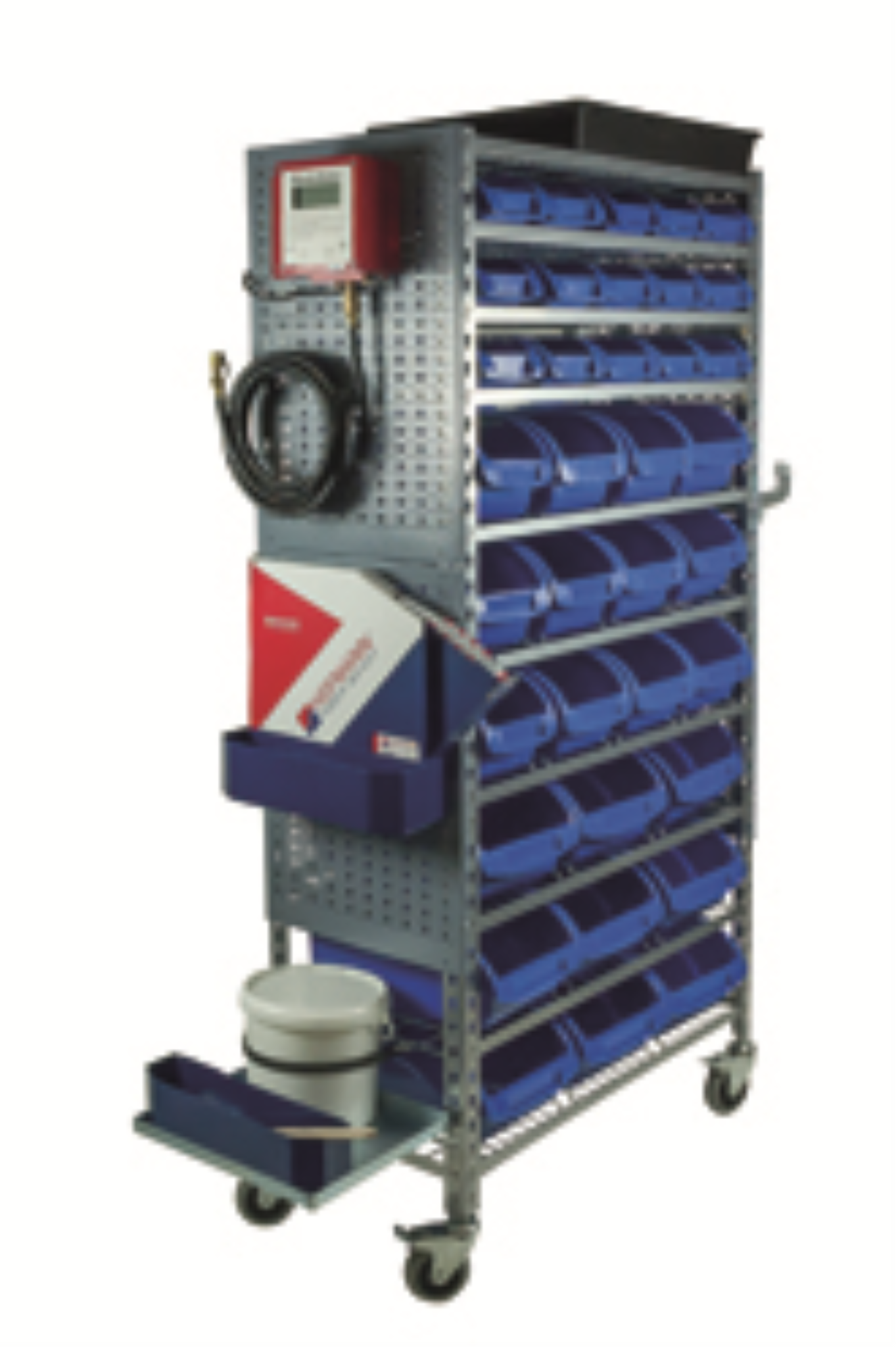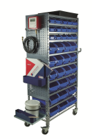 Mobiles Reifenserviceregal inkl. 36 Sichtkästen. Stabile Stahlblechkonstruktion mit 4 Lenkrollen, davon 2 feststellbar.