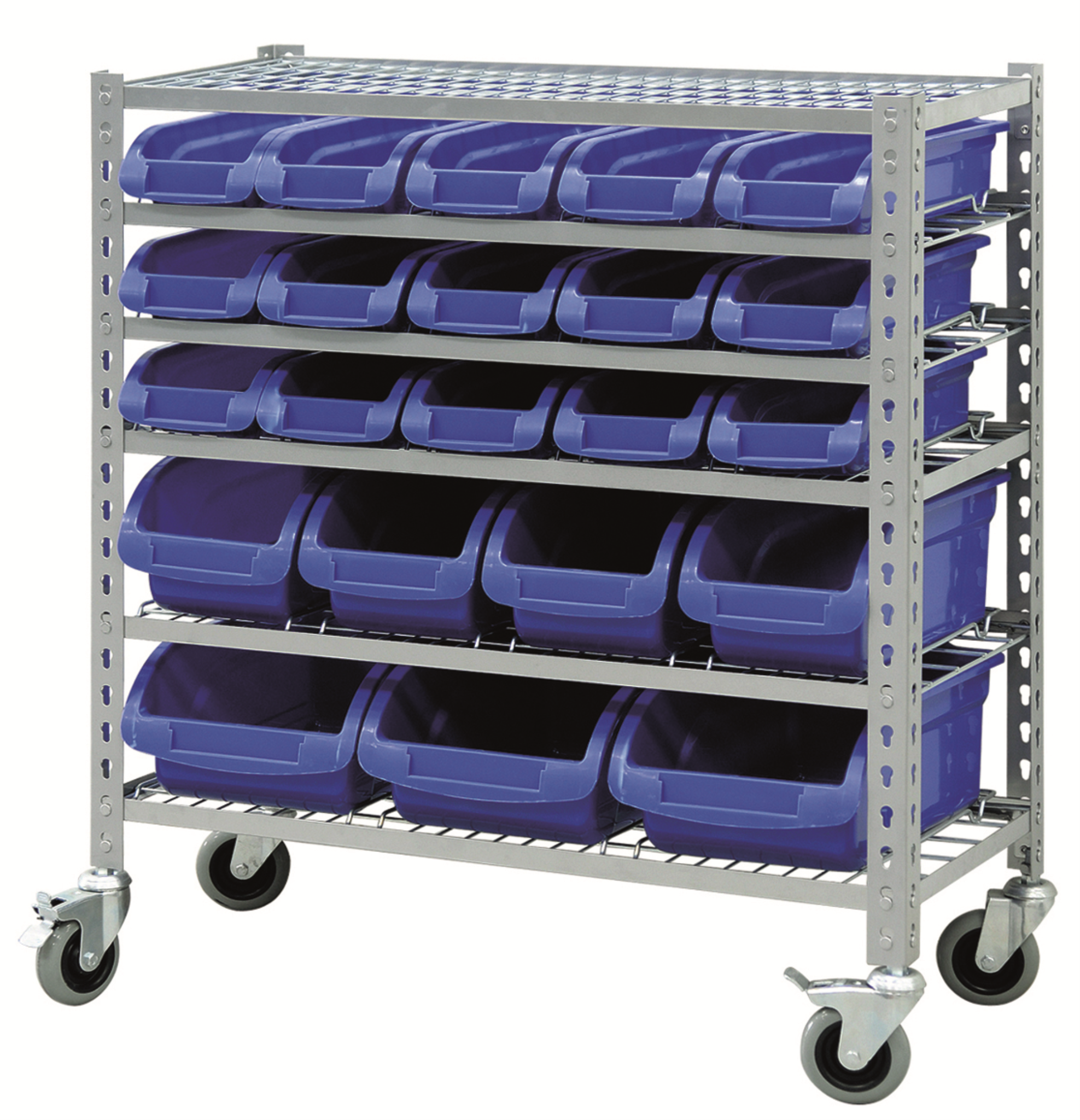 Mobiles Lagerregal inkl. 22 Sichtkästen zur Lagerung von Montage- und Kleinteilen. Stabile Stahlblechkonstruktion mit 4 Lenkrollen, davon 2 feststellbar.