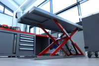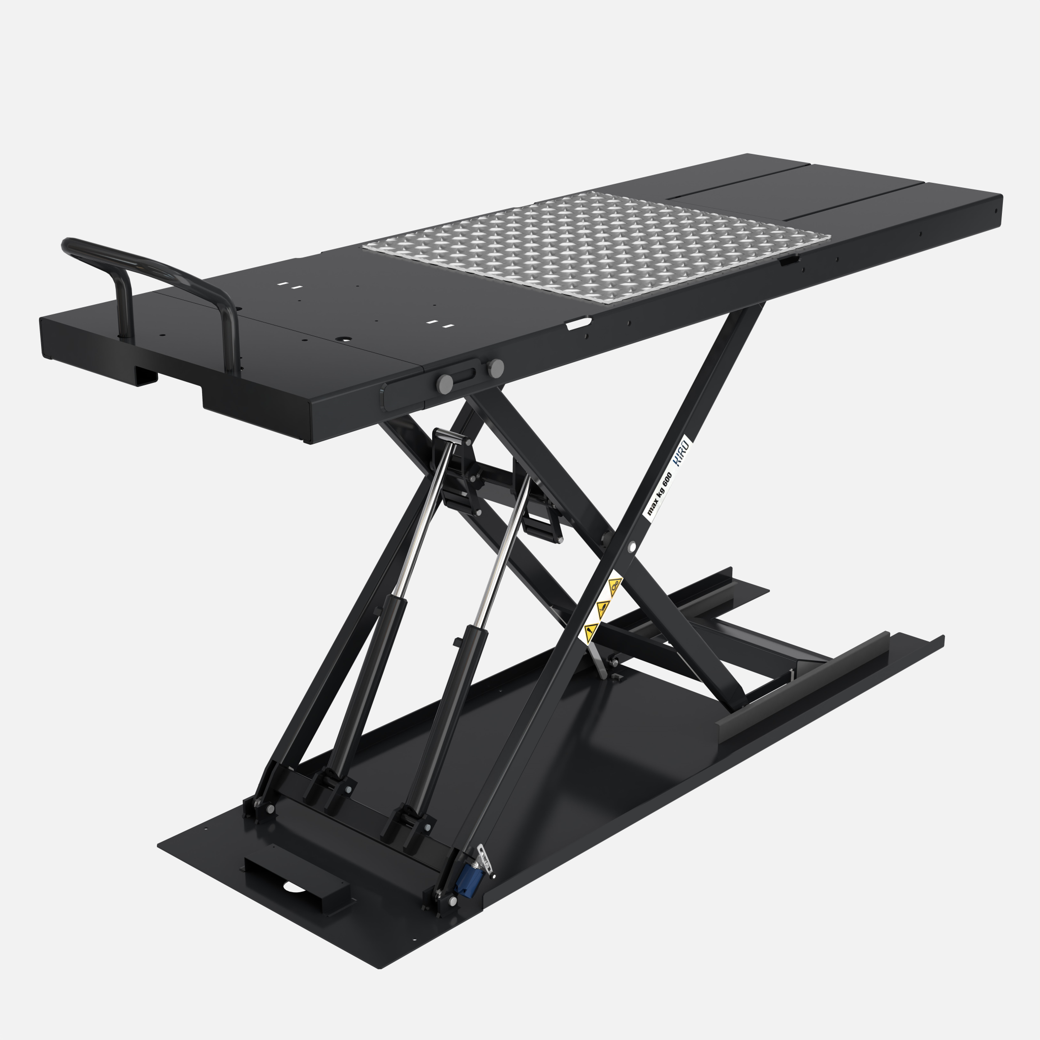 Zur einfachen Demontage der Räder verfügt die Motorradbühne über einen vorderen und hinteren Ausschnitt, ideal auch für die Demontage der Stossdämpfer und Gabel. Die Dicke des Blechs macht die Hebebühne robust und die geringe Auffahrhöhe ist zugleich ideal um die Bühne nicht im Boden versenken zu müssen.