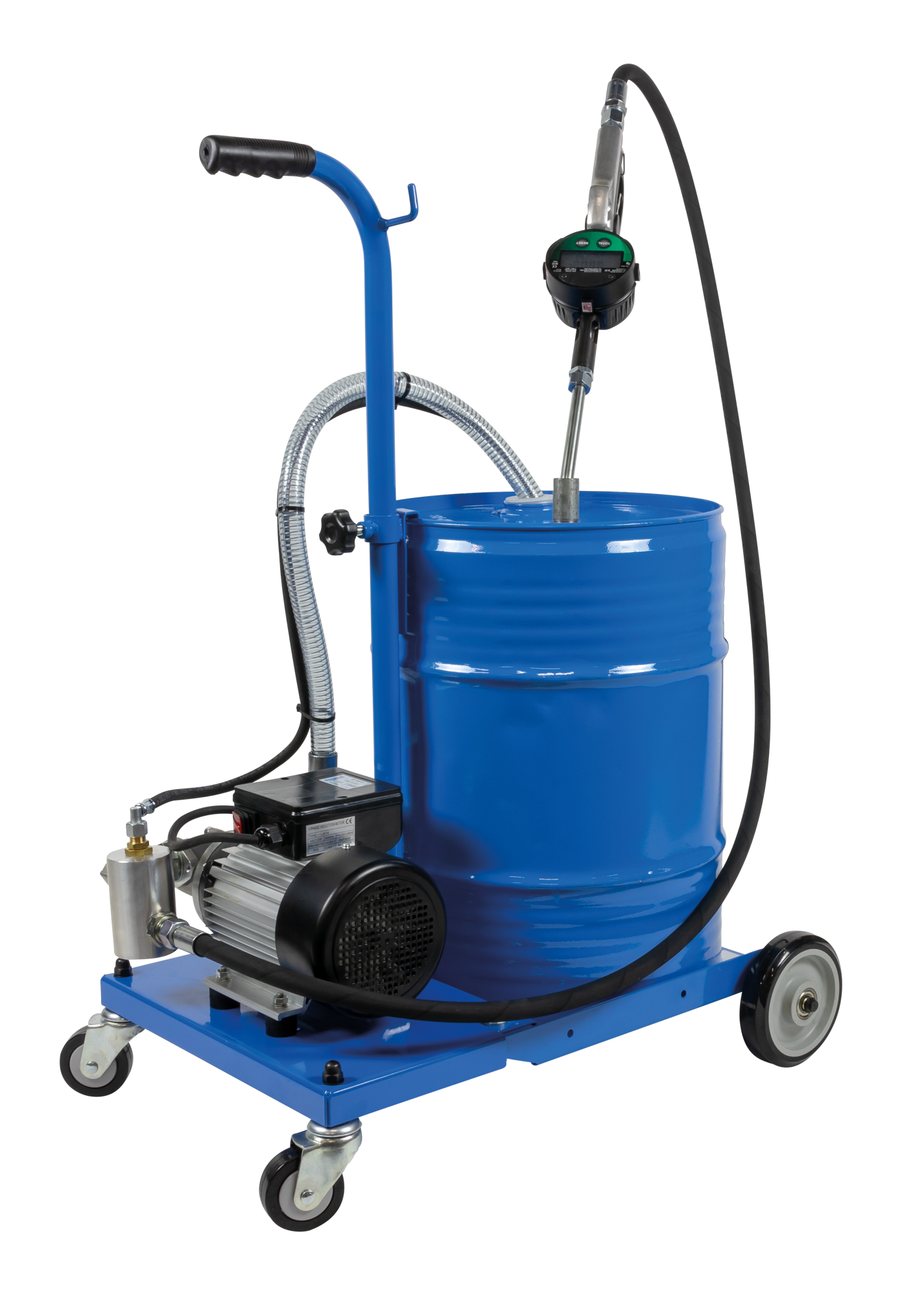 Mobiles Ölabgabeset in elektrischer Ausführung, für die Aufnahme von einem 60 Ltr.-Fass, eichfähig. Durch die sehr niedrig gehaltene Ladefläche ist ein Wechseln der Fässer schnell und einfach möglich.