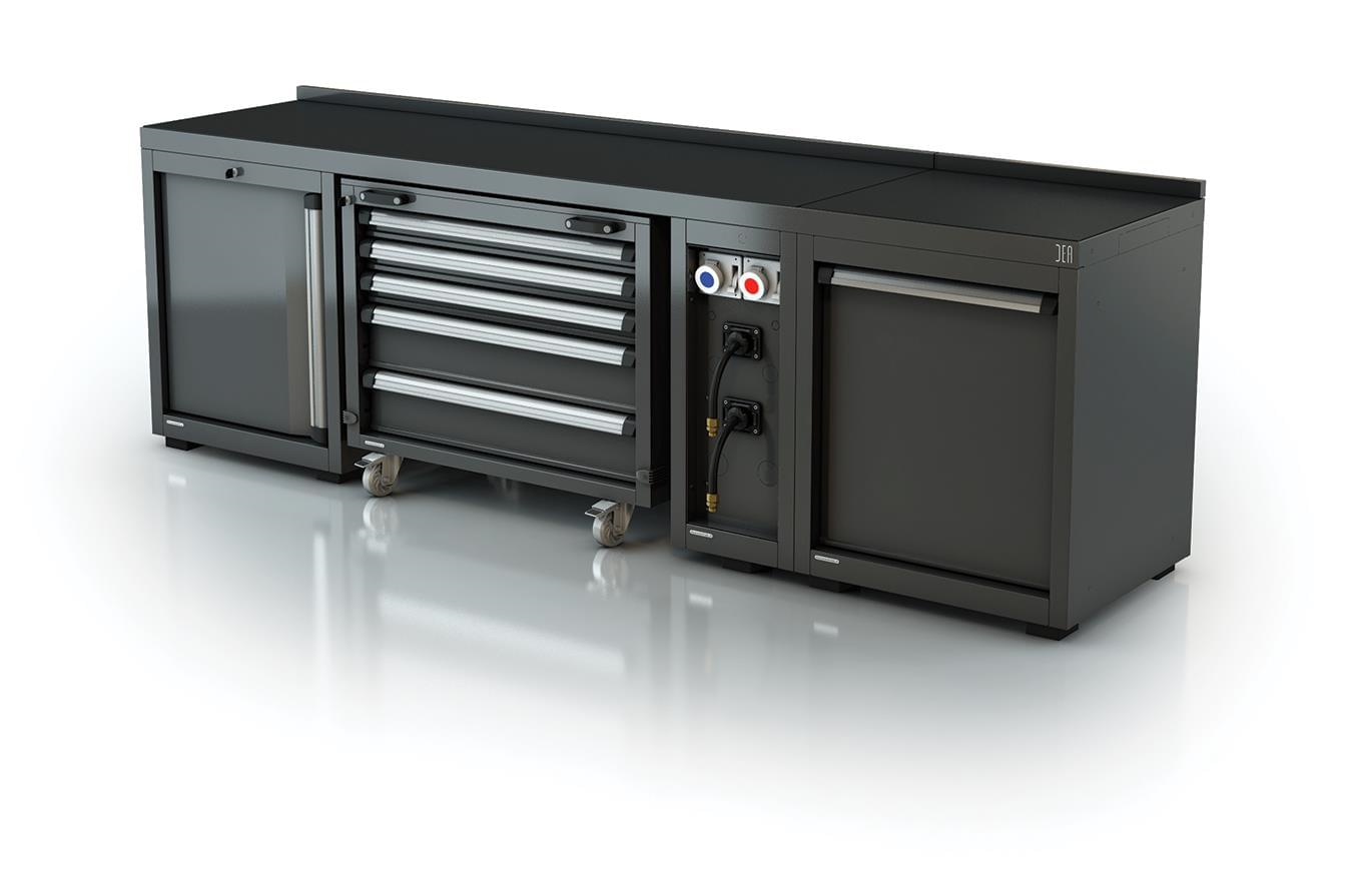 Arbeitsplatz für Mechaniker-Bereich einer Werkstatt mit Energie-Verteilung