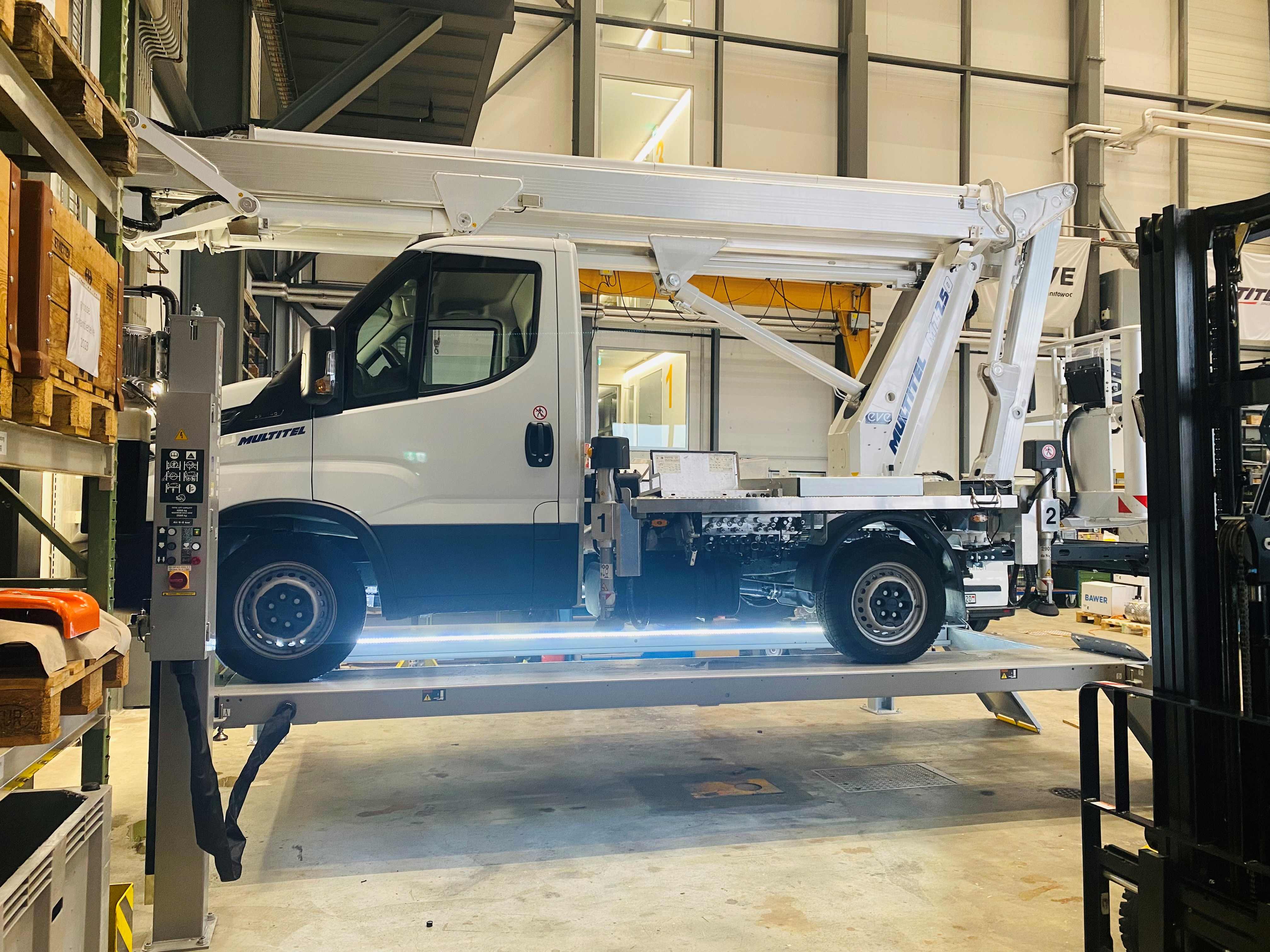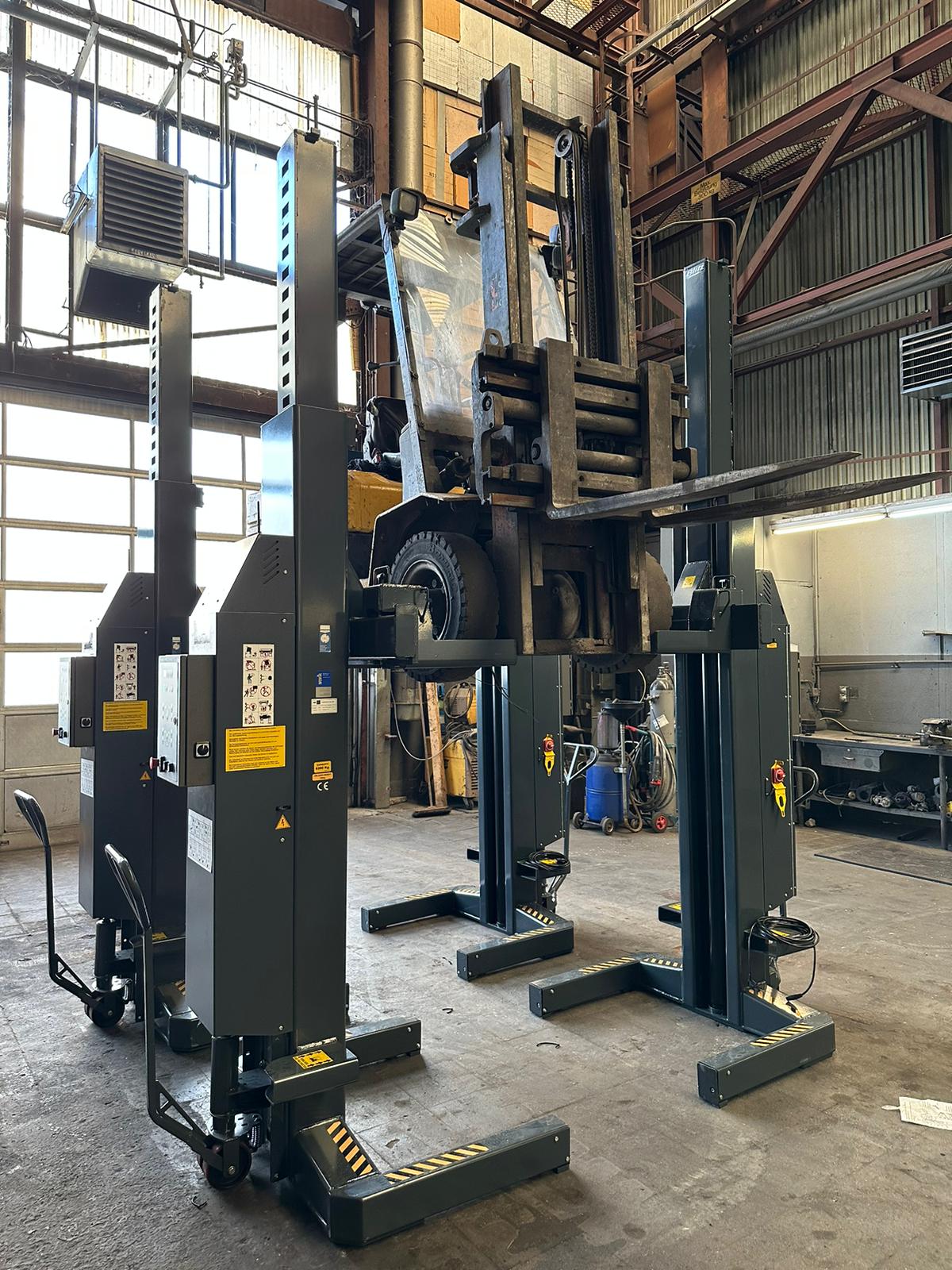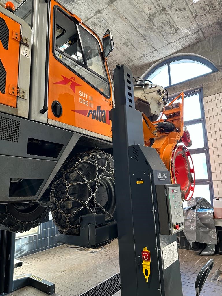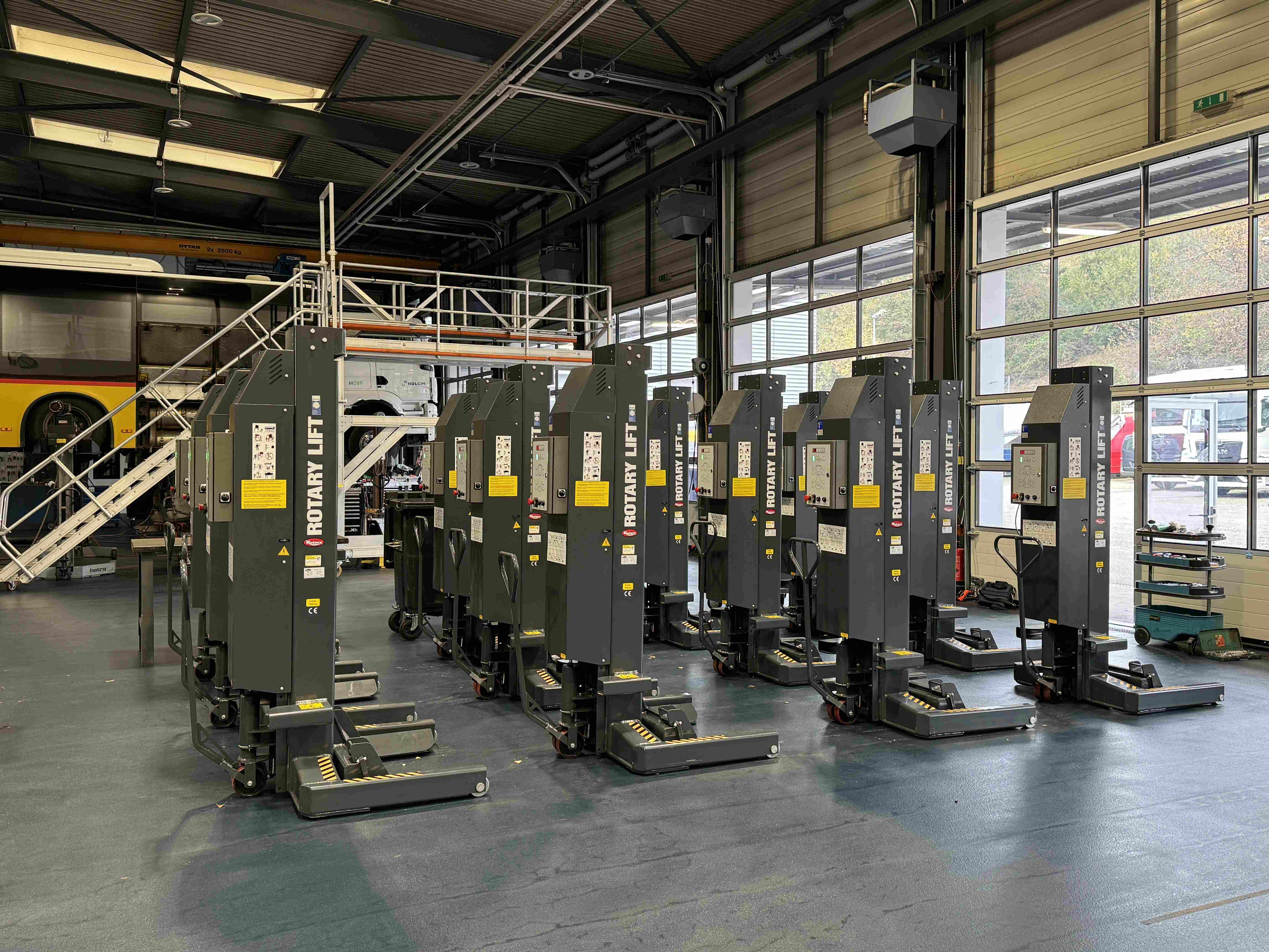 Mit der neuen Rotary 4-Säulen-Hebebühne SM40-47 hebt die Stirnimann AG Baumaschinen nicht nur mühelos die schmalen Hubarbeitsbühnen, sondern auch weitere Fahrzeugtypen aus ihrem Produktportfolio.