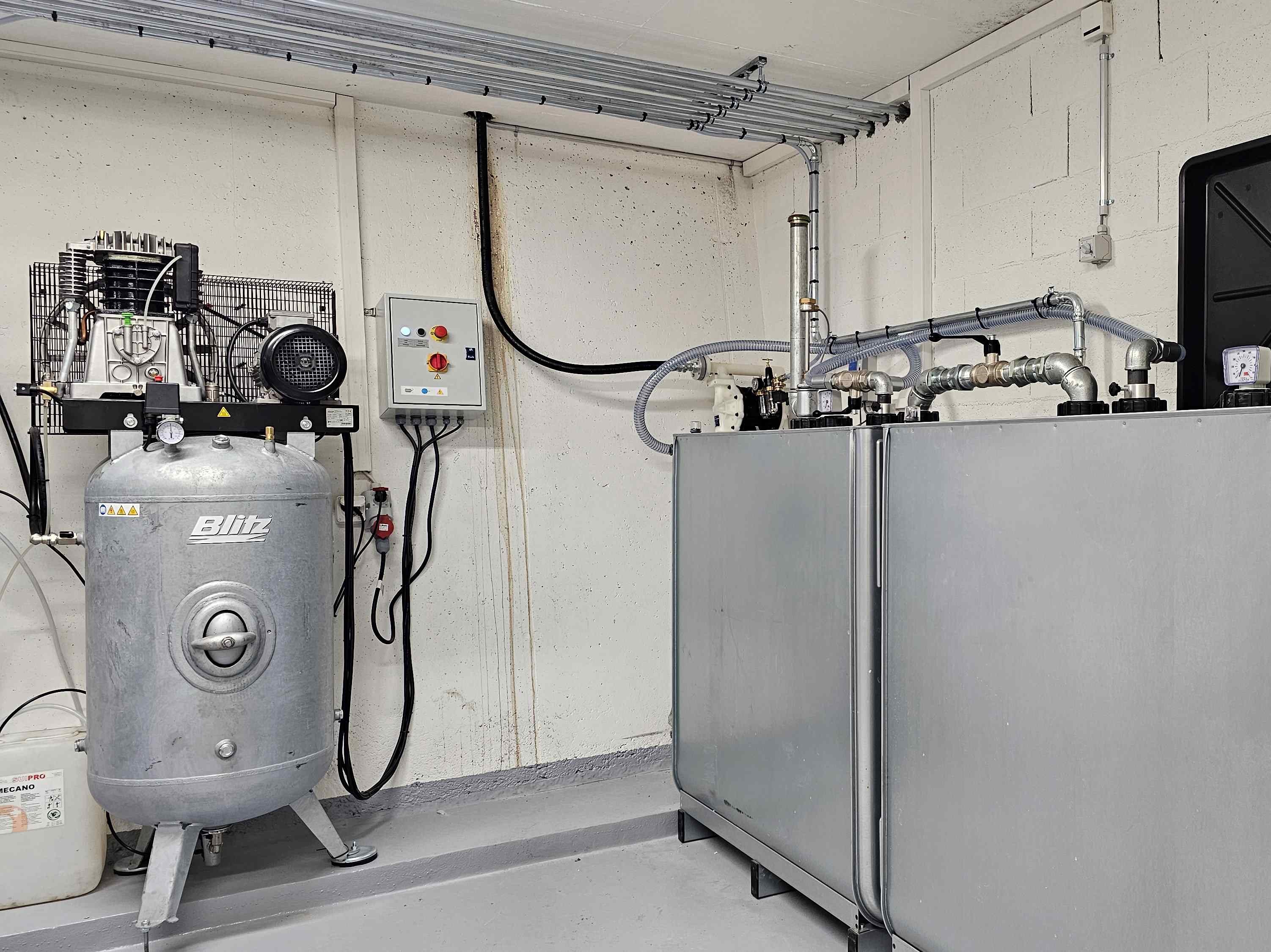 Frischölversorgung mit Elektropumpen ,Verrohrung für Altöl, Frischöl und Druckluft, Altölentsorgung und -lagerung mit Überwachung, Druckluftkompressor inkl. Lufttrockner und automatischer Entwässerung mit elektrischem Kugelhahn